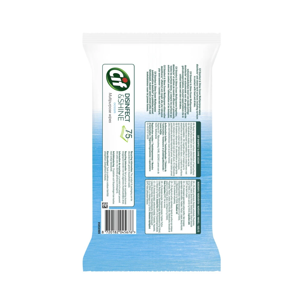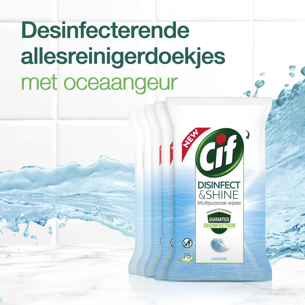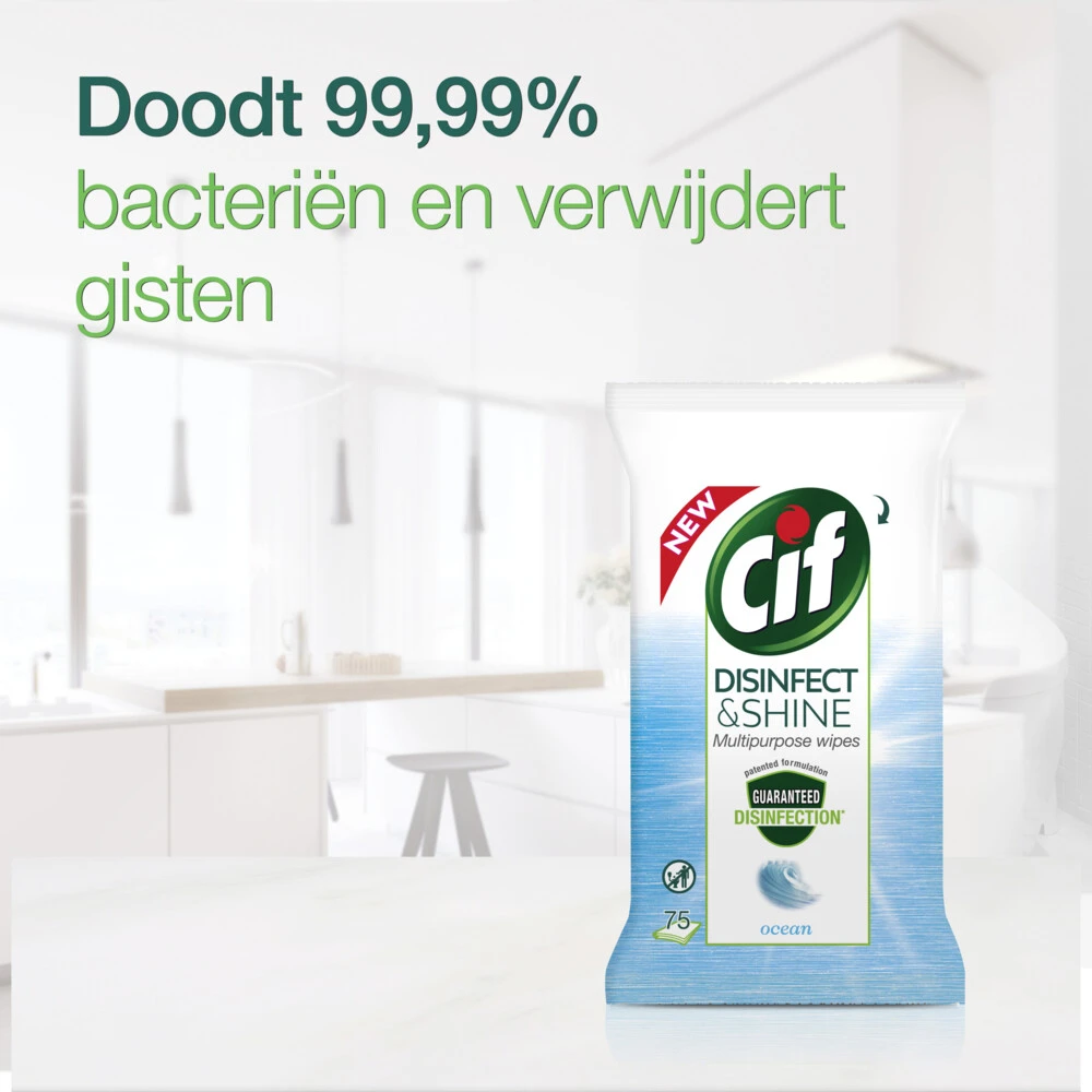 Cif Disinfect & Shine Wipes OceanCif Disinfect & Shine Ocean Wipes zijn ideaal voor het gemakkelijk desinfecteren van alle gebruiksoppervlakken.Cif is al jaren het nummer één merk in Nederland op het gebied van hygiëne en stralende schoonmaakresultaten. De Cif Disinfect & Shine range biedt het totaalpakket voor disinfectie en stralende schoonmaakresultaten voor thuis en onderweg. Een range van desinfectie artikelen zonder parfum, wat uniek is op de markt.Cif Disinf