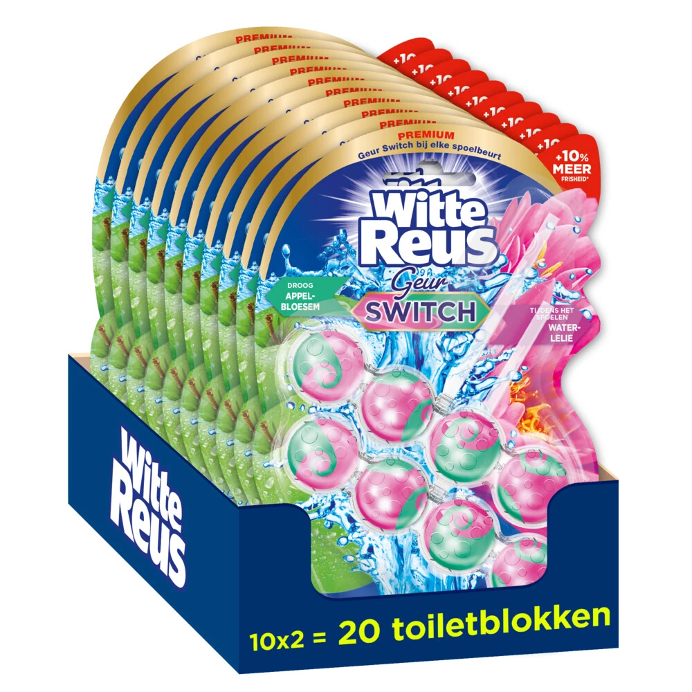 Witte Reus Toiletblok Geur Switch Appelbloesem WaterlelieMet het nieuwe Witte Reus Geur Switch toiletblok ben je verzekerd van een schoner en frisser toilet dan ooit. Dankzij de Aqua Active Technology in het toiletblok is het mogelijk om twee verschillende geuren in je toilet te ervaren, terwijl je maar één toiletblok gebruikt. Door de verbeterde formule verspreidt het toiletblok 10% meer geur dan de vorige Geur Switch varianten. De revolutionaire technologie bevat een All in 1 for