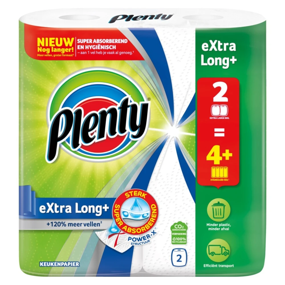 Plenty Keukenpapier Extra LongPlenty Extra Long keukenpapier gaat nu nog langer mee! Met 100 doekjes per rol bevat de nieuwe Plenty Extra Long 120% meer velletjes dan de normale rol. Daarnaast zijn de vellen nog groter dan eerst. Plenty eXtra Long is super absorberend – aan 1 vel heb je vaak al genoeg. Snel en hygiënisch schoon in het alledaagse huishouden, want door het eenmalige gebruik worden afgenomen bacteriën niet verder verspreid.120% meer vellen, groter formaatHygiën