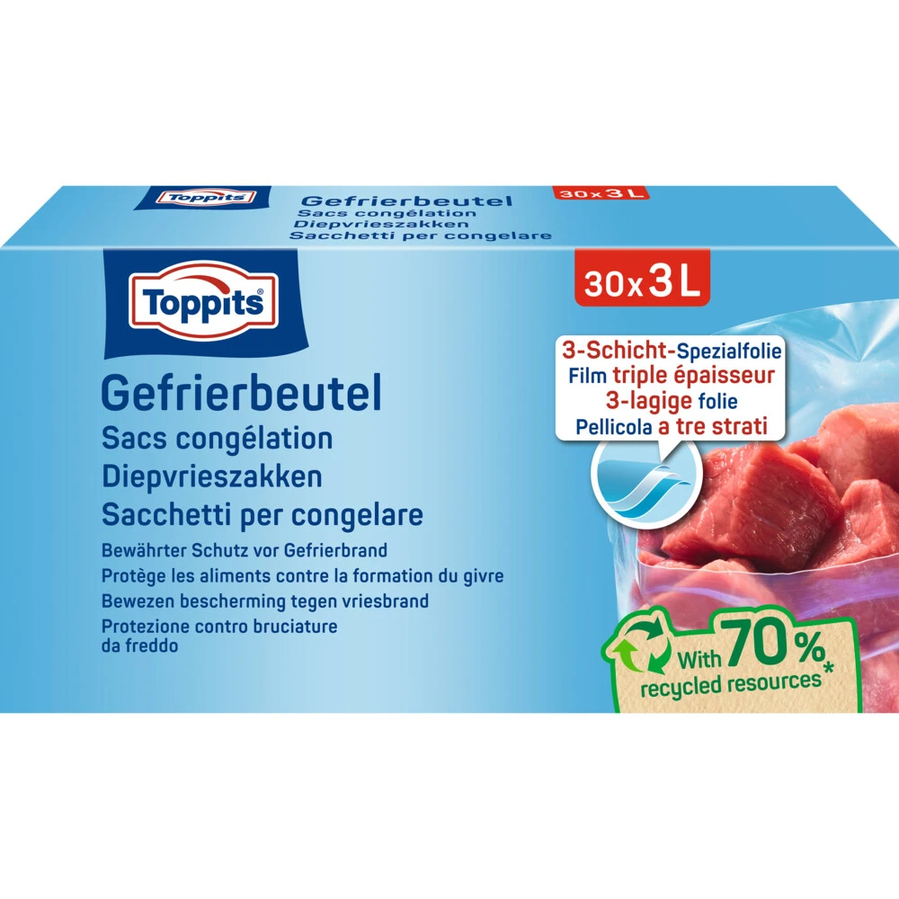 Toppits Diepvrieszakjes 3 liter 30 stuksToppits Diepvrieszakjes behouden versheid en smaak en bieden een optimale bescherming tegen vriesbrand. Met hun speciale drielagige folie zijn ze uitermate scheurvast en dankzij hun brede opening en platte bodem zijn ze heel makkelijk te vullen.Bieden een optimale bescherming tegen vriesbrandScheurvast