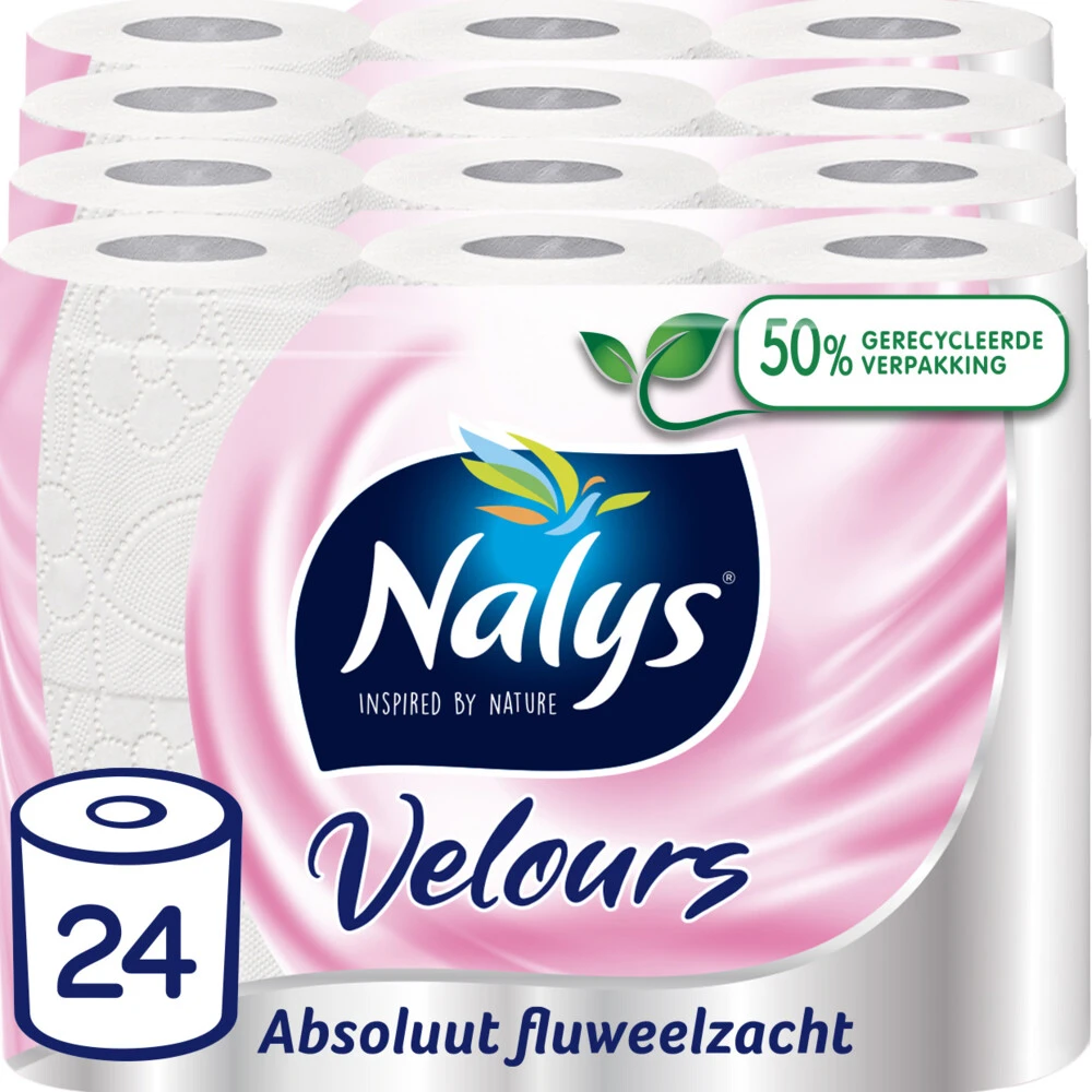 Nalys Velours Toiletpapier in 50% Hazy Poly 3-laagsDankzij zijn super dikke kussentjes, garandeert Nalys Velours u een optimaal comfort en een onberispelijke hygiëne. Een unieke 3-laagse technologie die sterkte en zachtheid biedt. FSC gecertifieerd, 50% gerecycleerde plastic verpakking. Een streling voor je huid, een uitzonderlijk gevoel van comfort.Door verschillende soorten natuurlijke vezels te combineren bekomt men een unieke textuur waarvan de zachtheid zowel stevigheid als lichtheid b