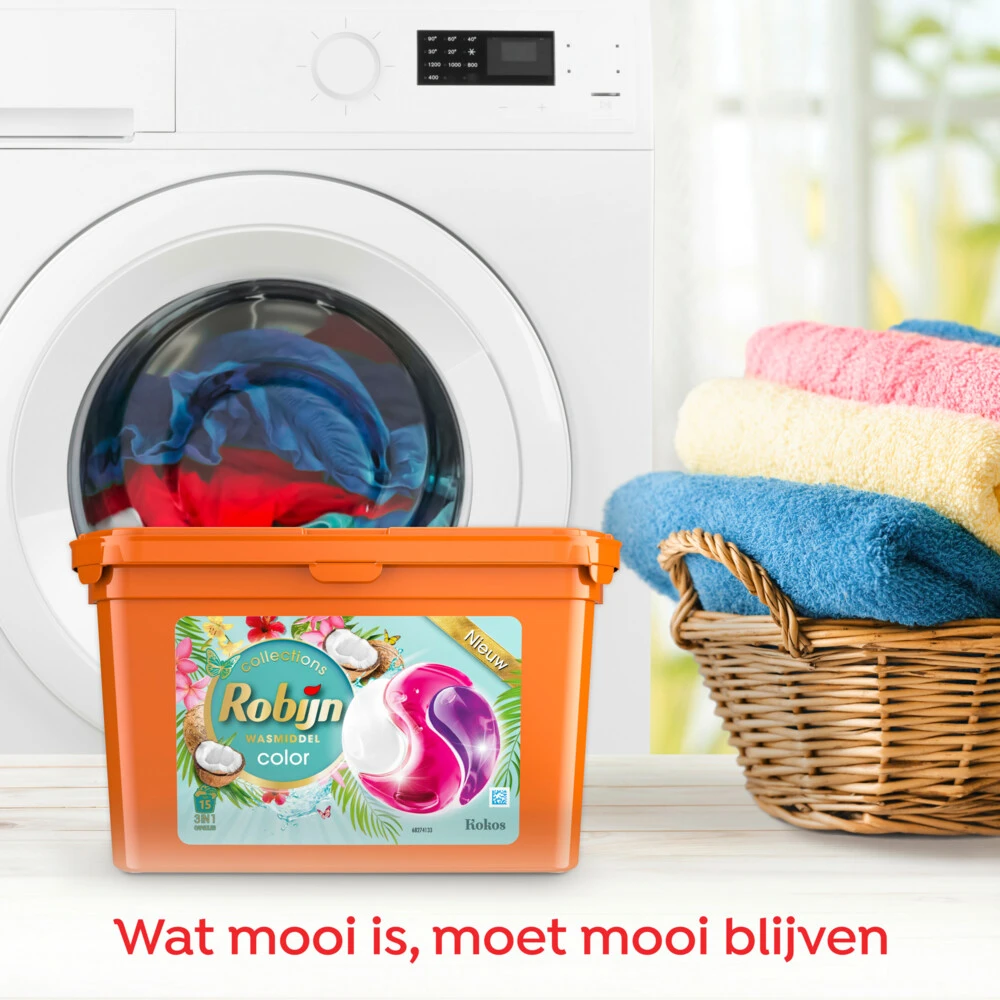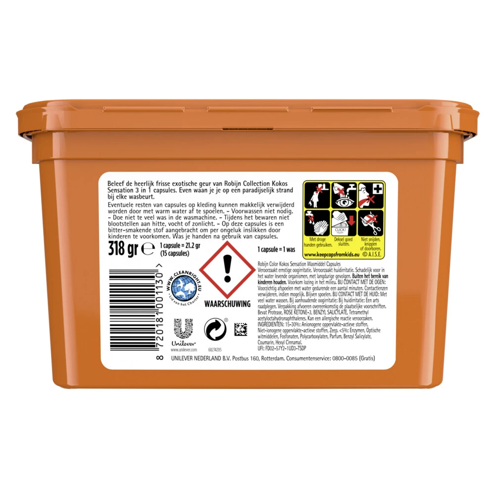 Robijn 3-in-1 Wascapsules KokosRobijn Kokos Sensation 3-in-1 wascapsules wassen je gekleurde was schoon en houden je kleding lang mooi met de heerlijke geur van kokos.Geniet van de heerlijke geur van Robijn Kokos 3-in-1 wascapsules3-in-1 wascapsules uit de exclusieve Robijn Collections lijnWaan je even op een tropisch eiland bij het openen van de wasmachineRobijn Kokos voor de gekleurde was houdt kleuren en kleding langer mooiRobijn capsules zijn makkelijk in gebruik en goed voor 15 wasbeurtenEe