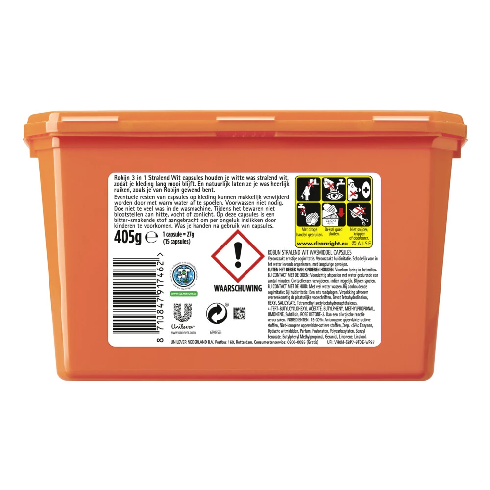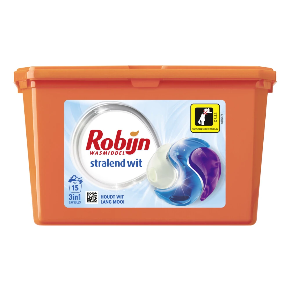Robijn Stralend Wit 3-in-1 Capsules WasmiddelRobijn Stralend Wit 3-in-1 wasmiddel capsules wassen je witte was schoon en houden je kleding lang mooi met de heerlijke geur van Robijn.Robijn 3-in-1 Stralend Wit wasmiddel capsules zijn speciaal ontwikkeld voor al je witte was. Robijn capsules zijn makkelijk in gebruik en houden je kleding lang mooi. De wascapsules wassen je kleding stralend schoon, zonder te vervagen en geven je was een langdurige frisse geur. Gebruik voor een optimaal resultaat in