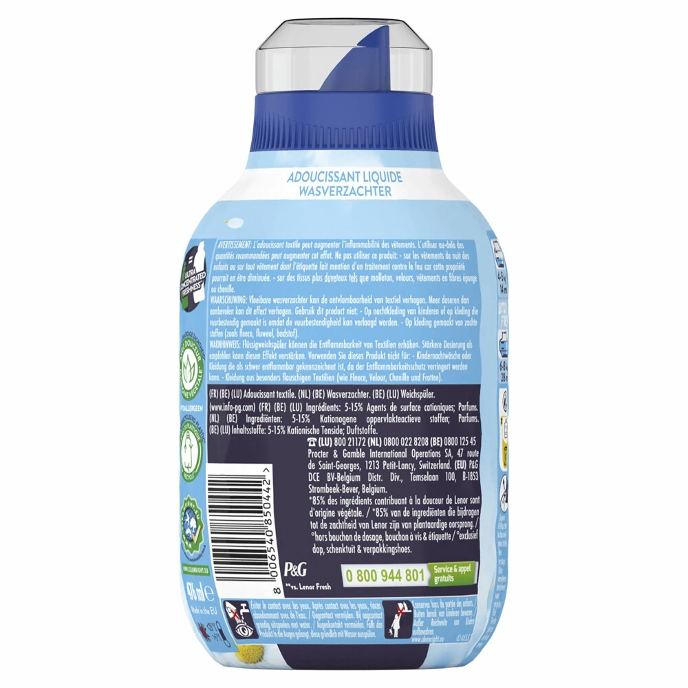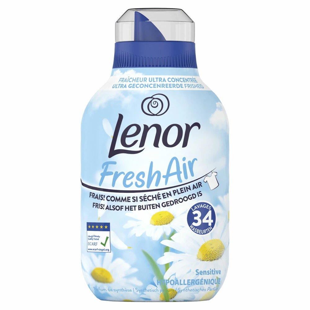 Lenor Fresh Air Wasverzachter Sensitive 34 wasbeurtenDermatologisch geteste en hypoallergene wasverzachterWasverzachter waarmee je de frisheid van buiten drogen ervaart, zelfs als je binnen droogtMet plantaardige zachtheidGerecyclede plastic fles (excl. dop, tuit en huls) en recyclebaar (excl. huls)