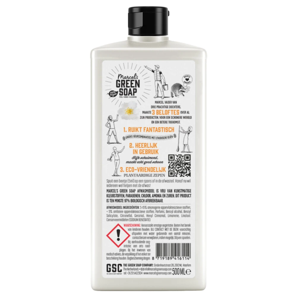 Marcelu0027s Green Soap Afwasmiddel Sinaasappel & JasmijnGemaakt van plantaardige zepen. Vriendelijk voor het milieu. Maar streng en meedogenloos voor dat vette glas of die aangekoekte pan. Verrijkt met biologische oliën en parfum, zodat afwassen (we durven het bijna niet te zeggen) een echte ‘geurbeleving’ wordt. En terwijl je wordt opgeslokt door die intense ervaring wordt de huid van je handen verzorgd door het zachte schuim en de verrijkende ingrediënten. Weet je w