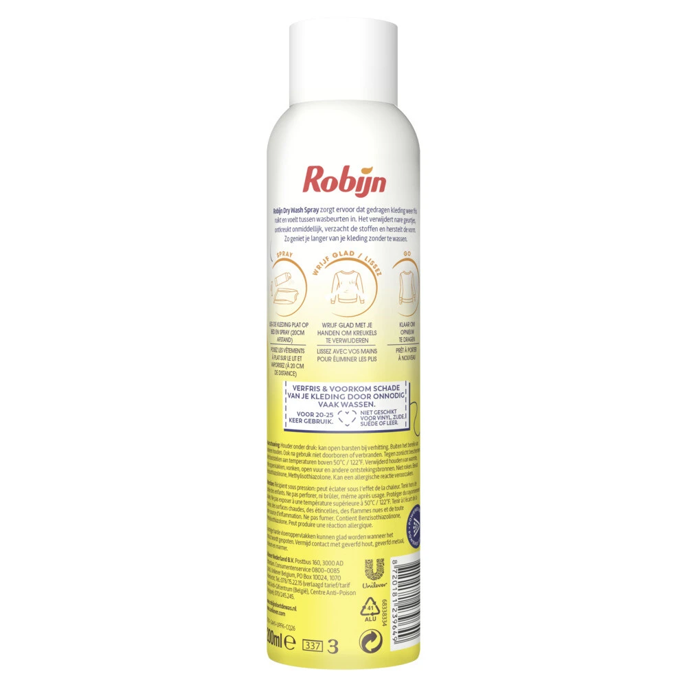 Robijn Dry Wash Spray Zwitsal 200 mlRobijn Dry Wash Spray Zwitsal verwijdert nare geurtjes, ontkreukt onmiddellijk, verzacht de stoffen en herstelt de vorm van je kleding.Robijn Zwitsal Dry Wash Spray verfrist je kleding tussen wasbeurten inDe Robijn Dry Wash Spray verwijdert nare geurtjesHaalt de kreukels uit je kleding en zorgt voor een frisse geurDe verfrissende spray verzacht de stoffen en herstelt de vorm van je klerenGeniet langer van je kleding zonder te wassenJe kunt de spray van Robijn