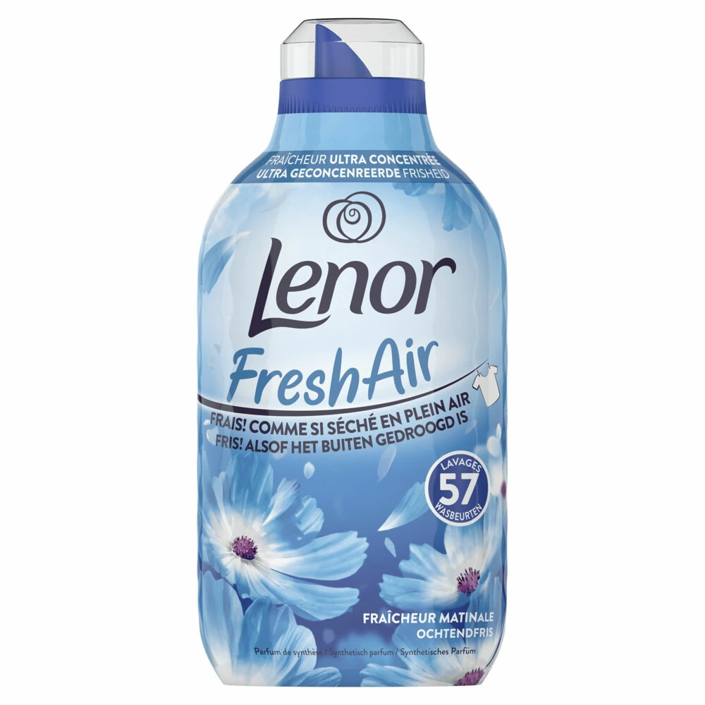 Lenor Fresh Air Wasverzachter OchtendfrisWasverzachter waarmee je de frisheid van buiten drogen ervaart, zelfs als je binnen droogtGerecyclede plastic fles (excl. dop, tuit en huls) en recyclebaar (excl. huls)Je favoriete Ochtendfris-geur met maritieme noten, een heerlijke citrusachtige geur en pure frisheidBeschermt je kleding tegen vervagen, pluizen en uitrekken