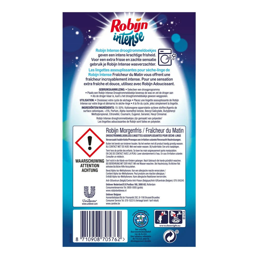 Robijn Intense Droogtrommeldoekjes Morgenfris 20 stuksRobijn Intense Morgenfris Droogtrommeldoekjes zorgen ervoor dat je wasgoed zacht en fris uit de droger komt.Robijn Intense Morgenfris Droogtrommeldoekjes voor een zachte, frisse wasRobijn Intense droogtrommeldoekjes helpen tegen statische kledingDe Morgenfris-geur is een heerlijk parfum in je wasdrogerBevat 20 doekjes voor 20 drogerbeurtenDe droogtrommeldoekjes zijn gebruiksvriendelijk verpaktGebruik ze met Morgenfris wasmiddel en wasverzacht