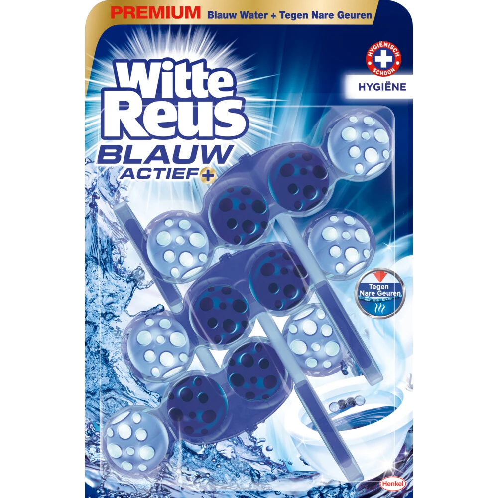 Witte Reus Toiletblok Blauw Actief HygieneOntdek Witte Reus Blauw Actief Hygiene voor een hygiënisch schoon en glanzend toilet. Dit toiletblok zorgt ervoor dat je toilet makkelijk schoon en fris te houden is van de eerste tot aan de laatste spoelbeurt.Het reinigend schuim zorgt voor een schoon toilet na elke spoelbeurtMaakt zichtbaar schoon dankzij de krachtige blauw water ballenVoorkomt de vorming van vuil en kalkaanslagExtra frisheid: laat een langdurige frisse geur achter in de badkamerN