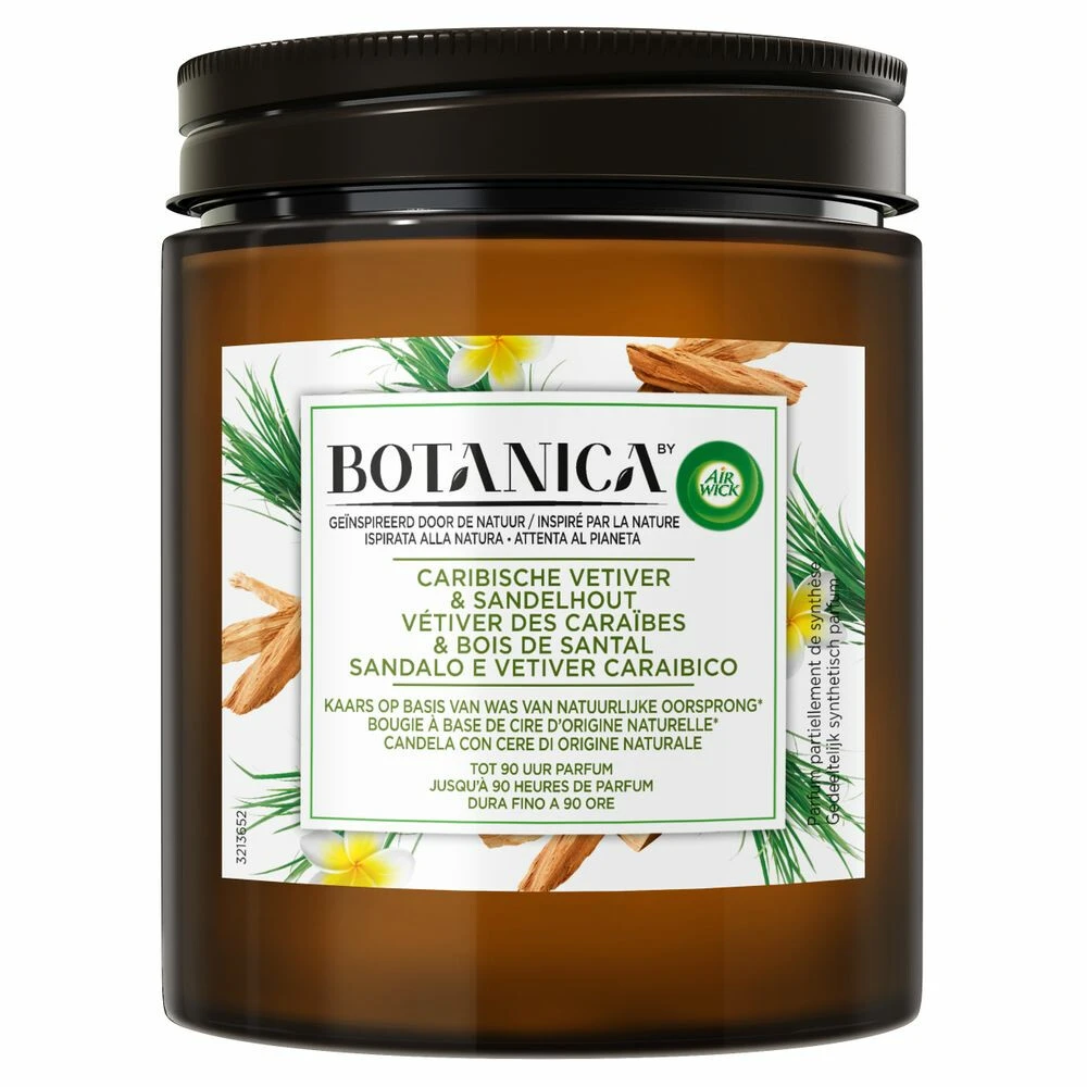 Botanica by Air Wick Geurkaars Caribische Vetiver & SandelhoutDe Botanica by Air Wick Geurkaars Caribische Vetiver & Sandelhout bevat ingrediënten die verantwoord worden geplukt. De geurkaars is dierproefvrij en 100% recyclebaar. De grote geurkaars van 500 gram heeft een brandtijd van 90 uur.De Botanica geurkaarsen zijn ontwikkeld op basis van exotische ingrediënten van natuurlijke oorsprong die op verantwoorde wijze geteeld zijn.De oogst van de ingrediënten draagt bij aan de ontwikkeling