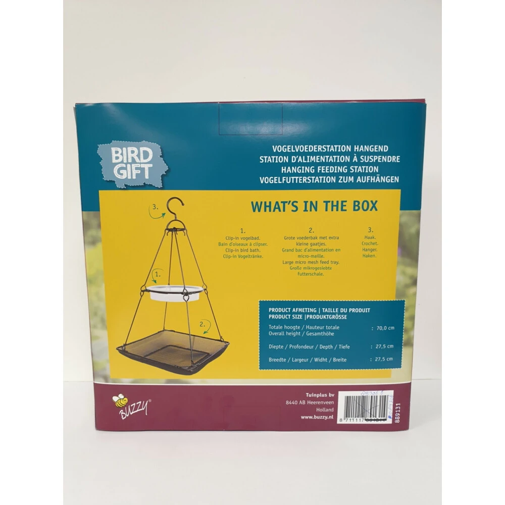 Bûten Vogelstation HangendDit hangende voederstation bestaat uit een grote voederbak met extra kleine gaatjes en een clip-in vogelbad. Makkelijk op te hangen d.m.v. een haak. Gemakkelijk op te hangenGrote voederbakExtra kleine gaatjes