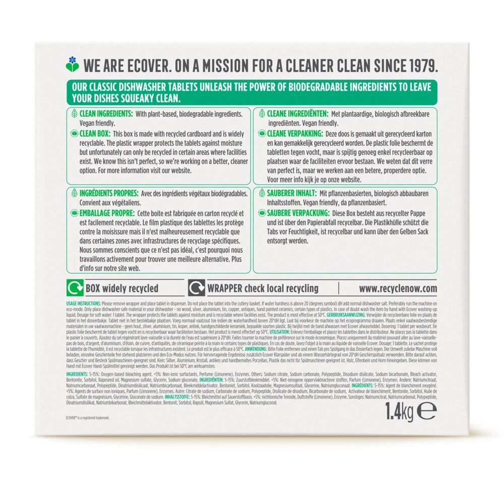 Ecover VaatwastablettenEen sprankelend resultaat voor al je bestek en vaatwerk. De sterk ontvettende eigenschappen van Ecover vaatwastabletten zorgen keer op keer voor een vet- en vlekvrij resultaat, en dat alles zonder die overbodige chemicaliën. Het subtiele parfum zorgt voor een hygiënische spoeling van je vaatwasser.Ontvet krachtigMakkelijk doseerbaarPlantaardige en minerale ingrediënten