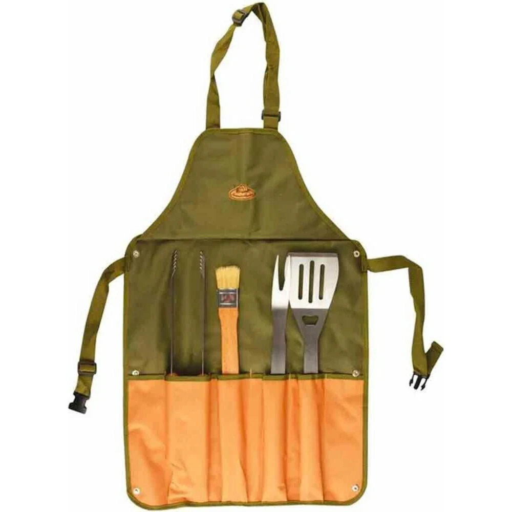 Esschert Design BBQ Schort Met Gereedschap GroenWie kent het probleem niet? Vetspetters op de kleding tijdens het BBQu0027en. En daarnaast onstaat altijd het probleem waar je het BBQ gereedschap laat tijdens het BBQu0027en. Deze handige set biedt de uitkomst voor deze problemen. Het vierdelige RVS gereedschap met essenhout handvaten bestaat uit een griltang, grilvork, spatel inclusief flessenopener en BBQ kwast. Als er niet geBBQu0027ed wordt dan kan het grilgereedschap in de vakken van de sc