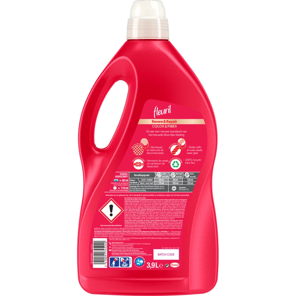 Fleuril Wasmiddel Color & Fiber 3.9 liter – 65 wasbeurtenDe nieuwe Fleuril Renew Advanced formule met Fibrex-Tech is speciaal ontwikkeld om actief te zorgen voor je kleding. Het hestelt je kleding al na enkele wasbeurten. De intens verzorgende formule maakt niet alleen perfect schoon maar zorgt ook voor de kleuren en vezels.Herstelt de kleurenHernieuwt en herstelt de kleurintensiteitStrijkt zelfs ruwe vezels glad voor een betere lichtreflectieVersterkt de vezelsHelpt vezels te versterken zod