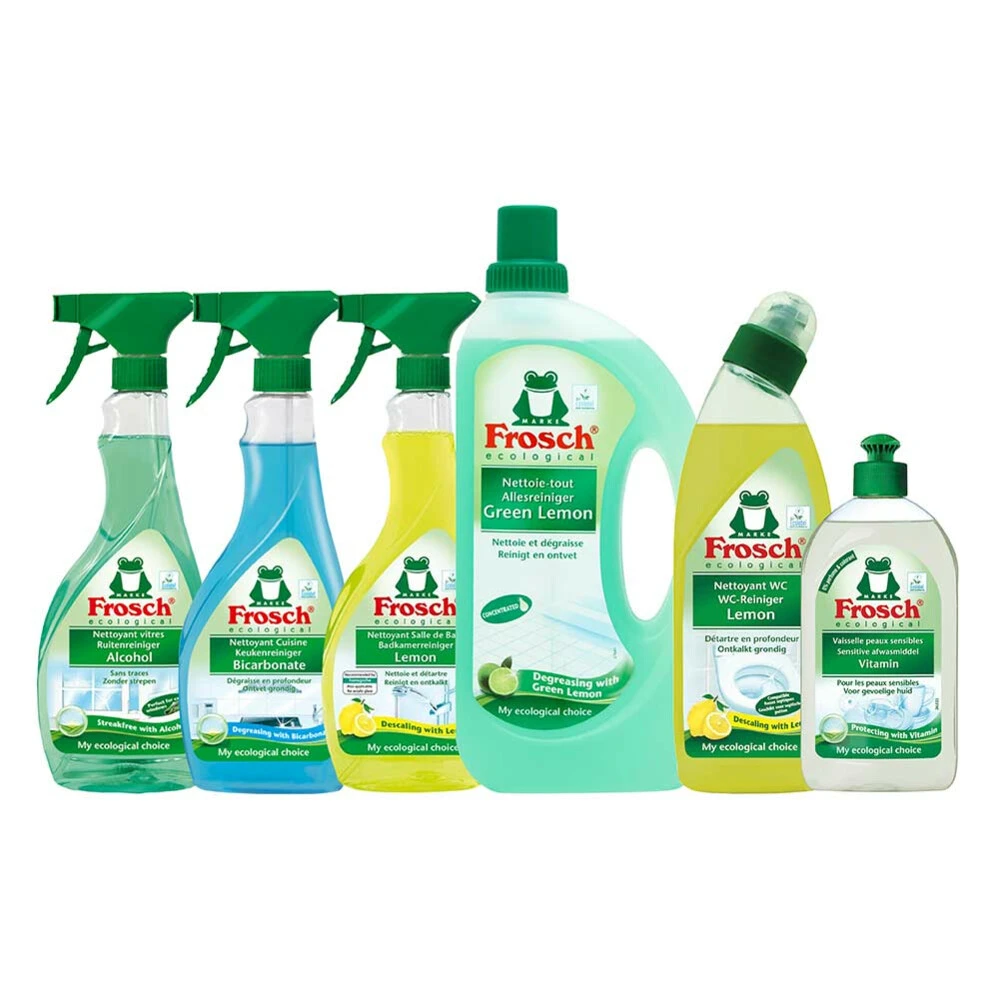 Frosch Reinigings PakketHet Frosch Reinigingspakket bevat alle populaire producten van Frosh. Van keuken tot wc reiniger, je bent van alles voorzien met dit pakket.Frosch Allesreiniger Green Lemon, deze ecologisch verantwoorde allesreiniger maakt super schoon, zonder dat er resten op de oppervlakken achterblijven. De allesreiniger reinigt je vloeren en wasbare oppervlakken vloeren en wasbare oppervlakken: keuken, badkamer,… waar onze allesreiniger gebruikt wordt, verdwijnen vuil en vetspo