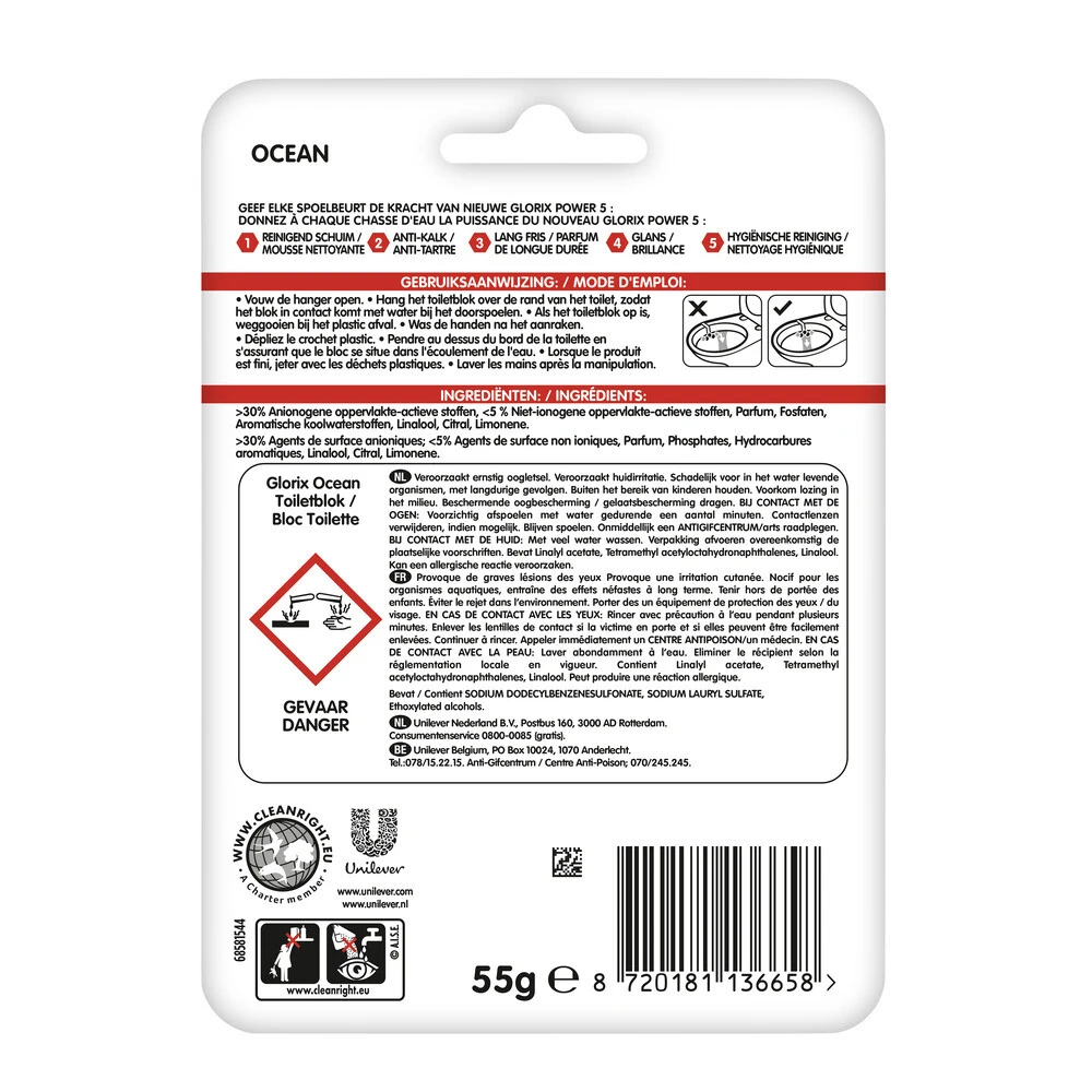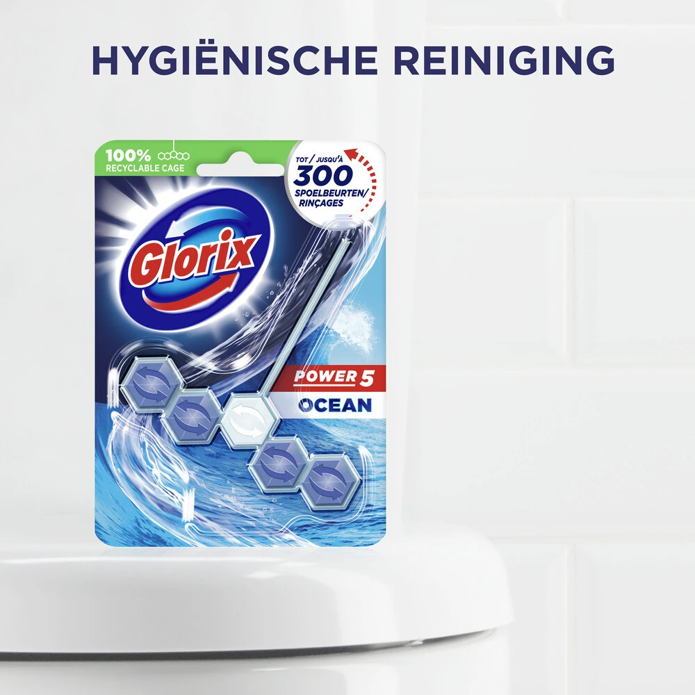 Glorix Power 5 WC Blok Ocean Halfjaarbox- 300 SpoelbeurtenGeef elke spoelbeurt de kracht van nieuwe Glorix Power 5 met het Glorix Ocean WC Blok. Het Glorix Ocean WC Blok geeft elke spoelbeurt de kracht van de Glorix Power 5, tot wel 300 spoelbeurten lang. Het product heeft diverse voordelen! Het reinigend schuim met anti-kalk werking houdt je toilet lang fris en zorgt bovendien voor glans en een hygiënische reiniging. Zo geniet jij dagelijks van een schoon toilet. De hanger is bovendien 100