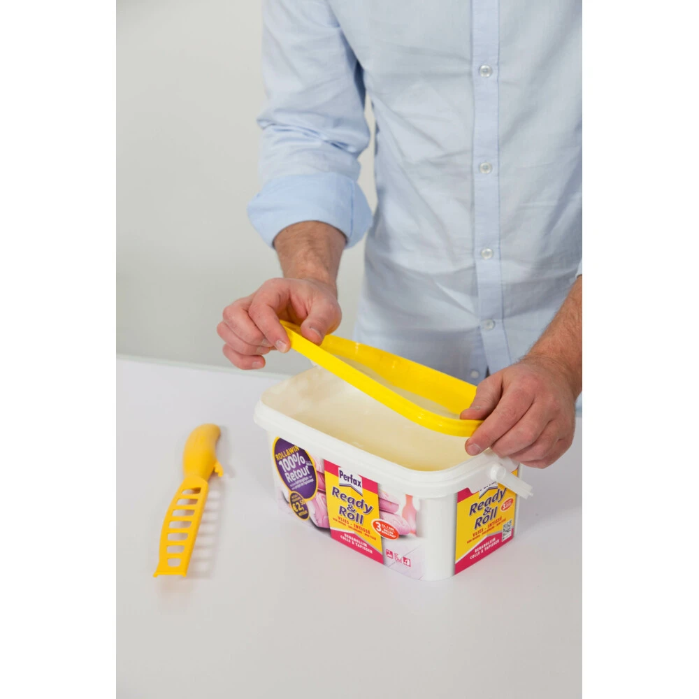 Perfax Vliesbehanglijm Ready & rollPerfax gebruiksklare behanglijm voor het verlijmen van alle soorten vliesbehang, snelbehang, smartpaper, fotobehang, non-woven behang of ander behang met vliesrug, op normaal absorberende ondergronden zoals o.a. steen, beton, stucwerk, gips en cement. Handige rechthoekige emmer voor roller of kwast.Kant-en-klaarDirect op de muurGoed corrigeerbaar, makkelijk verrwijderbaar