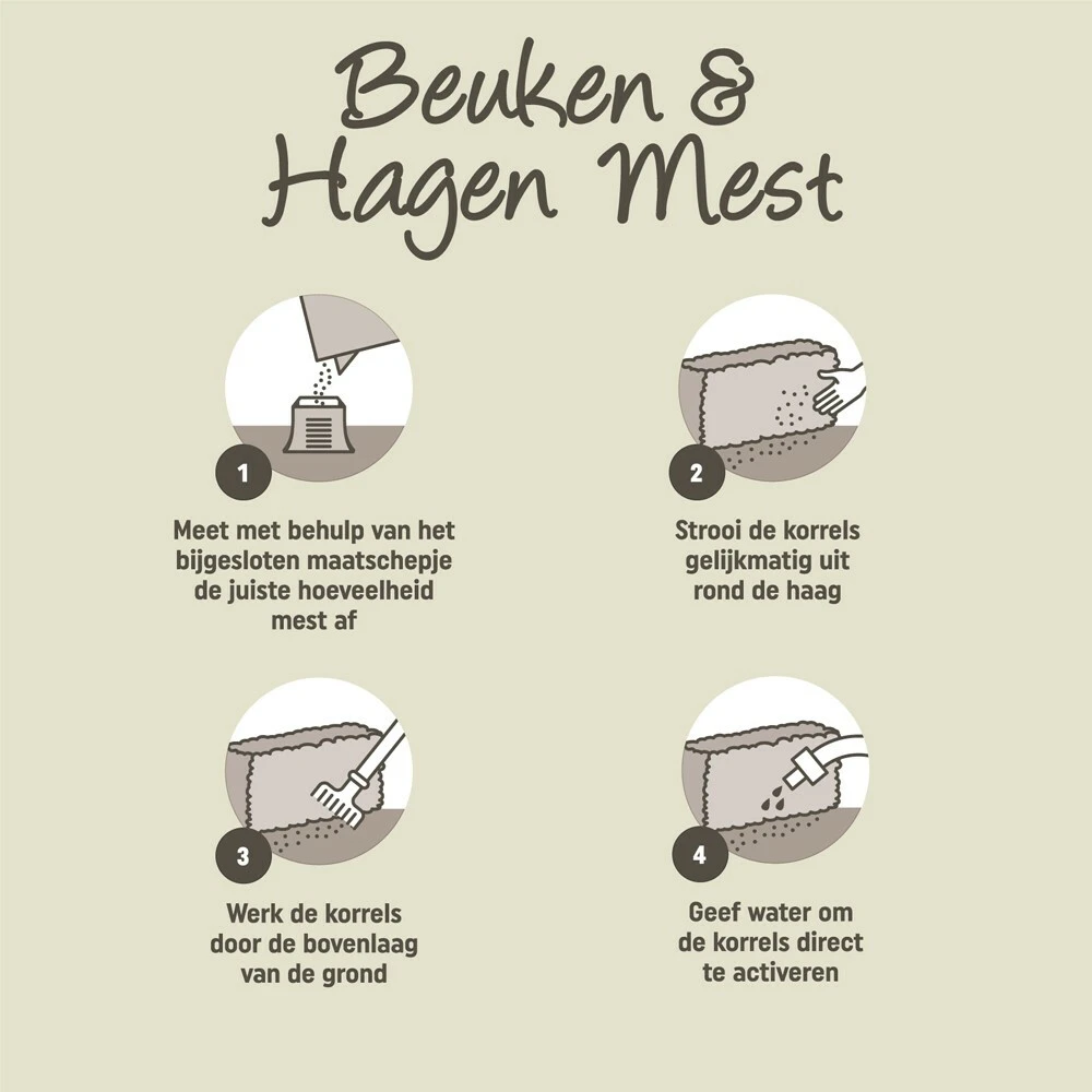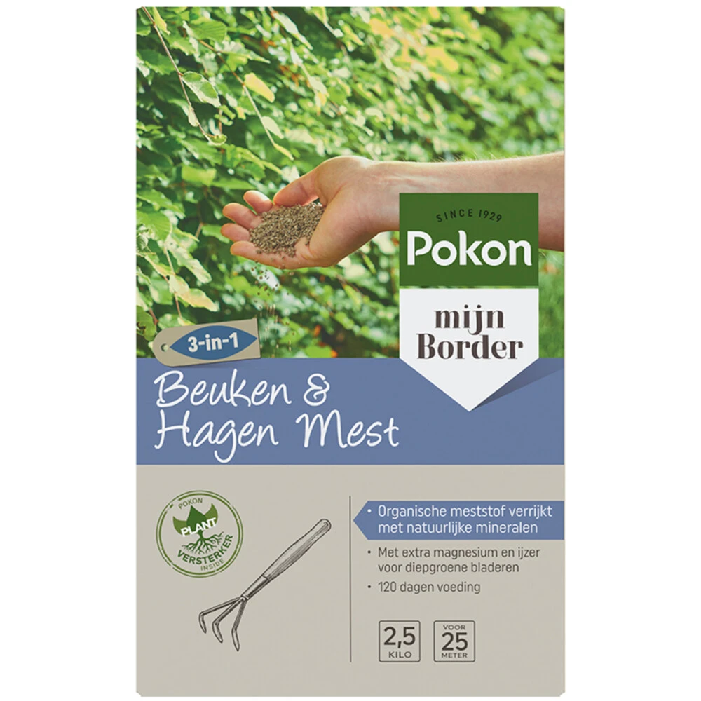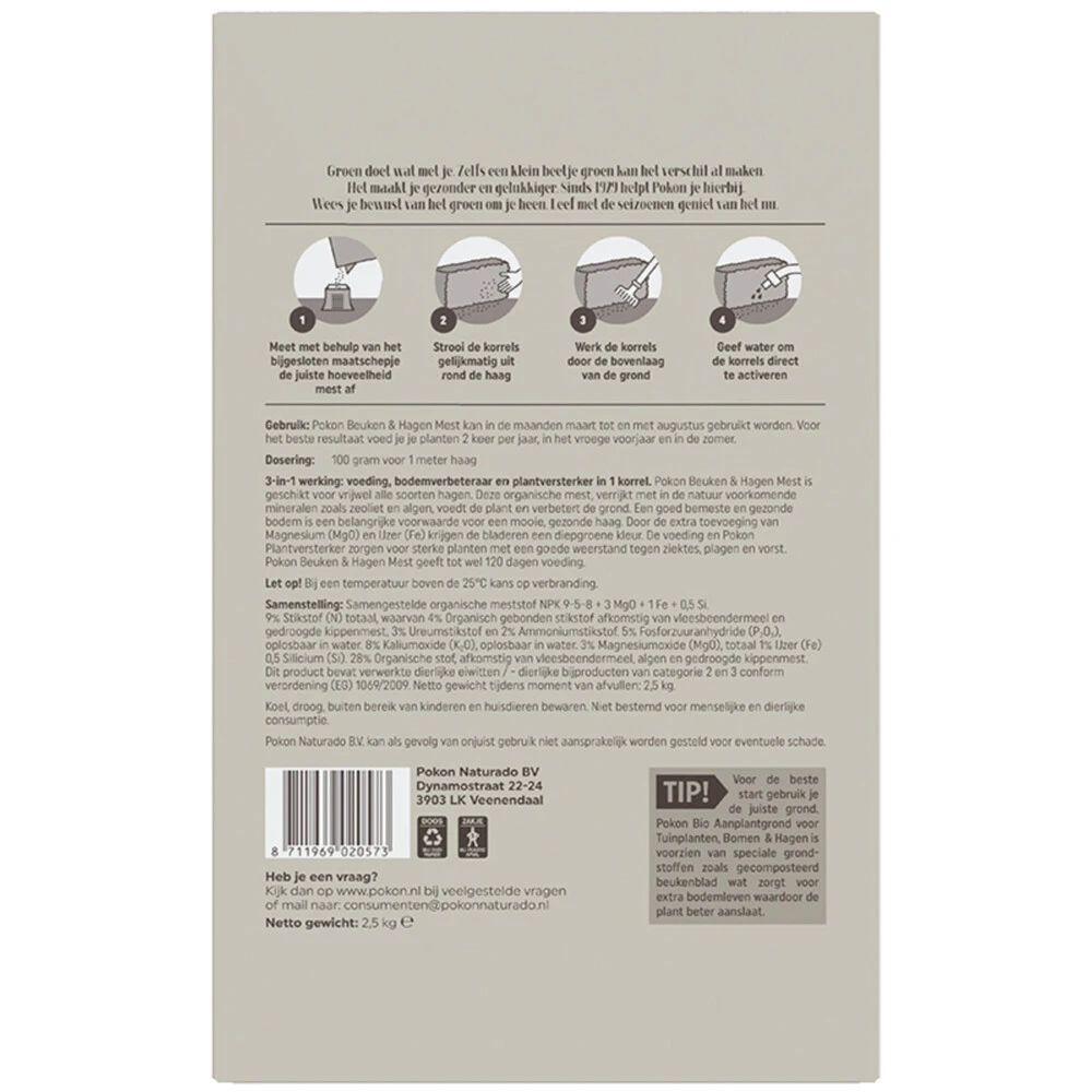 Pokon Beuken & Hagen Mest3-in-1 werking: voeding, bodemverbeteraar en plantversterker in 1 korrel. Pokon Beuken & Hagen Mest is geschikt voor vrijwel alle soorten hagen. Deze organische mest, verrijkt met in de natuur voorkomende mineralen zoals zeoliet en algen, voedt de plant en verbetert de grond. Een goed bemeste en gezonde bodem is een belangrijke voorwaarde voor mooie, gezonde haag. Pokon Beuken & Hagen Mest geeft tot wel 120 dagen voeding. Pokon Beuken & Hagen Mest kan in