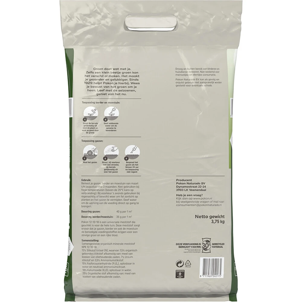 Pokon Tuinmest 12-10-18 Organisch MineraalPokon Tuinmest 12-10-18 is een universele meststof die geschikt is voor de hele tuin. Deze meststof zorgt ervoor dat je gazon, border en ook de moestuin de benodigde voedingsstoffen krijgen voor een stevige groei en een rijke bloei. Bemest je gazon, border en moestuin van maart t/m augustus elke 3 maanden.Geschikt voor de hele tuinStimuleert een stevige groei en rijke vloeiGeschikt voor de periode van maart t/m augustus