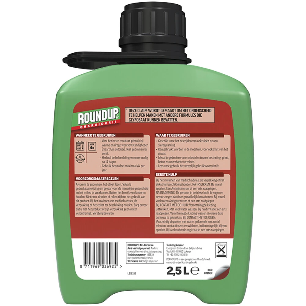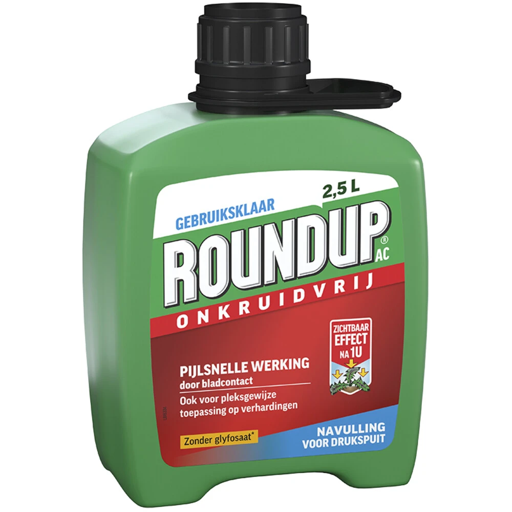 Roundup AC Snel Onkruidvrij Onkruiddrukspuit NavulverpakkingRoundup® AC Snel Onkruidvrij Onkruiddrukspuit Navulverpakking 2,5L is een snelwerkende onkruidbestrijder: actief groeiend onkruid wordt binnen een dag gedood. Het hoeft niet aangemengd te worden en is altijd juist gedoseerd. Deze 2,5L navulverpakking is geschikt voor de Roundup® AC PUMP u0027N GO, maar is ook goed te gebruiken voor in een normale drukspuit. De werkzame stof in deze in deze Roundup® onkruidbestrijder is azij