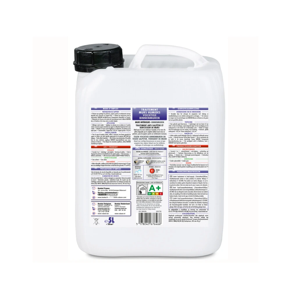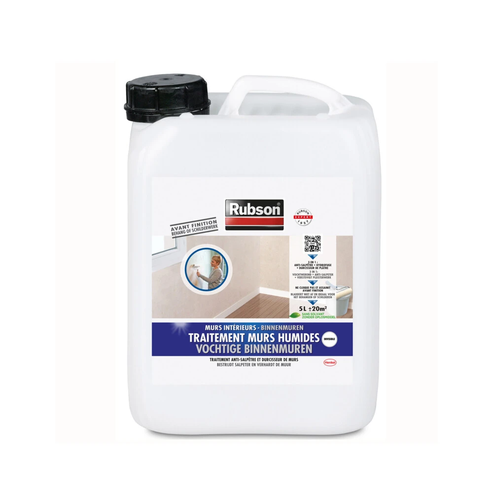 Rubson Coating BinnenmurenPreventieve en actieve behandeling voor het schilderen of behangen. Vormt een vochtwerend scherm op binnenmuren gesitueerd boven grondniveau. Te gebruiken voor het behangen of schilderen. Voorkomt onder andere blaarvorming in de verf en loskomend behang. Eveneens geschikt voor de bescherming van binnenmuren in decoratieve baksteen.Water beschermendFixeert de ondergrond.Verhardt oudere pleisterlagen.Vervangt voor het behangen of schilderen de impregneer laag.