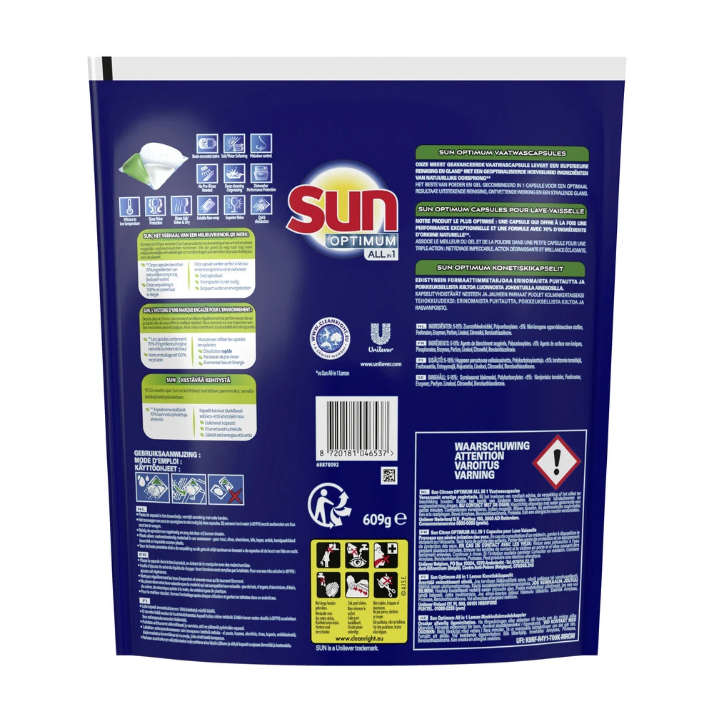 Sun Optimum All-in 1 Vaatwascapsules CitroenSun Optimum All-in 1 Citroen Vaatwascapsules zorgen voor een optimaal resultaat, uitstekende reiniging, ontvettende werking en stralende glans, zelfs in het korte en eco-programma van je vaatwasser.Sun Optimum All-in 1 Citroen Vaatwascapsules besparen tijd en energieDe vaatwascapsules zijn 100% effectief in korte en eco-vaatwasprogrammau0027sHet beste van poeder en gel in één capsule voor een optimaal resultaatMet spoelglans voor een str