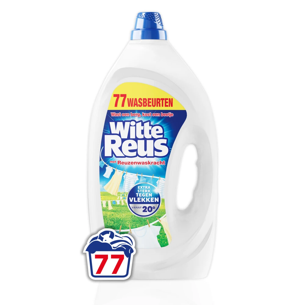 Witte Reus Vloeibaar WasmiddelWitte Reus Gel is het ideale vloeibaar wasmiddel voor gezinnen met kinderen. Dankzij zijn Reuzenwaskracht is het wasmiddel extra sterk tegen vlekken en was je er extra veel was mee schoon. De krachtige gel is te gebruiken van 20°C tot 90°C en zorgt voor hygiënisch en stralend schoon wit en lichtgekleurd wasgoed. Witte Reus. Wast een berg, kost een beetje.Witte Reus Vloeibaar Wasmiddel Gel is dankzij zijn Reuzenwaskracht extra sterk tegen vlekken, en zor