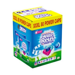 Witte Reus Wasmiddelcapsules 3+1 Power Caps WitWitte Reus Power Caps is een uniek voorgedoseerd wasmiddel voor wit wasgoed, dat geweldige wasresultaten biedt voor een scherpe prijs. De pods combineren drie sterke krachten in 3 kamers van één capsule voor hygiënisch schoon wasgoed. Dankzij de unieke reinigingstechnologie, zorgen deze verschillende krachten voor Reuzenwaskracht, Stralend Schoon en Fris wasgoed en is Extra sterk tegen vlekken, zelfs bij lage temperaturen. De Witt